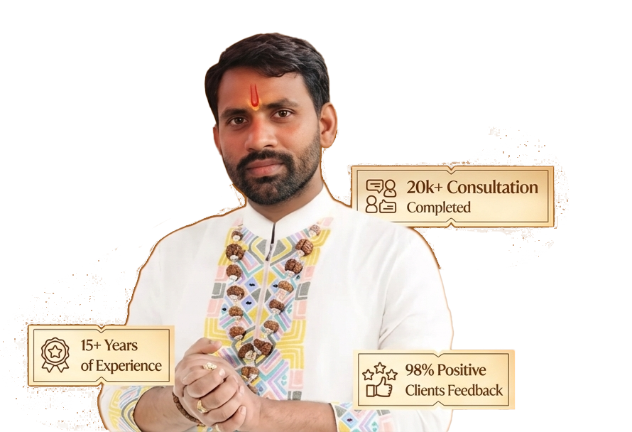 My approach blends traditional Vedic wisdom with compassionate, personalised guidance. Every consultation is conducted with complete honesty and deep spiritual intent — helping you navigate love, marriage, career, health, and family matters with clarity.